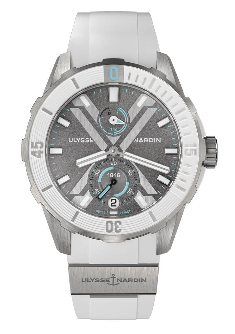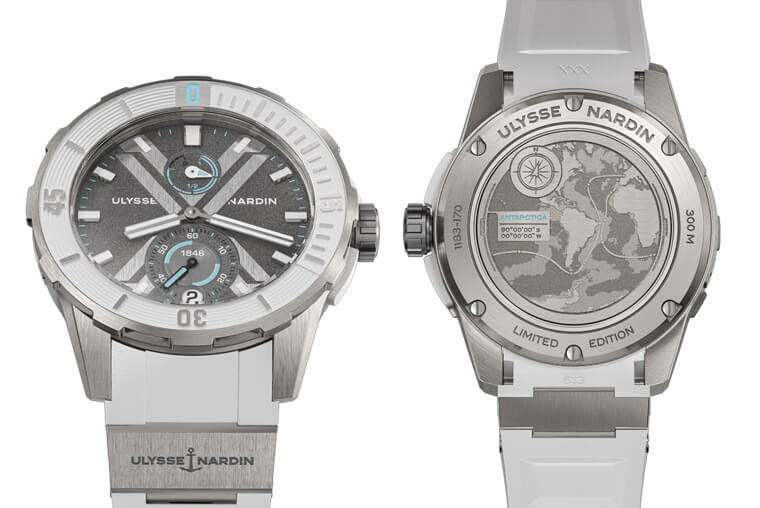 白色橡膠錶帶讓人聯想到南極大陸純淨潔白的地貌,手錶背面圖案詳細記錄了南極大陸座標:緯度90°(沒有精度是因為位於地球最南端的大陸不需要標示經度),還詳細記錄了Vendée Globe旺代環球帆船賽的比賽路線。南極洲錶款面盤上的冰藍色元素代表漂浮在海面的冰山,噴砂面盤下方突顯了雅典錶的品牌標誌,白色橡膠錶圈與錶帶相得益彰。灰色面盤上印有顯眼而優雅的“X”字樣,錶冠、錶耳、錶背均採用鈦金屬製成。