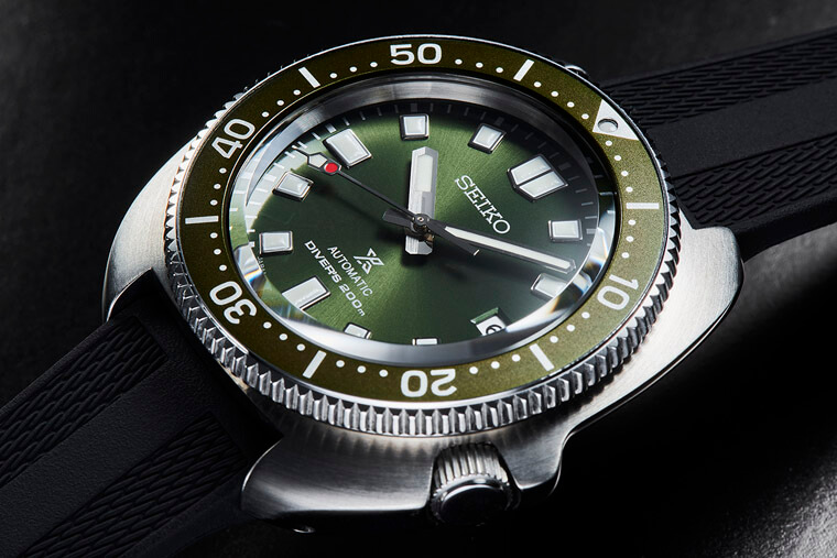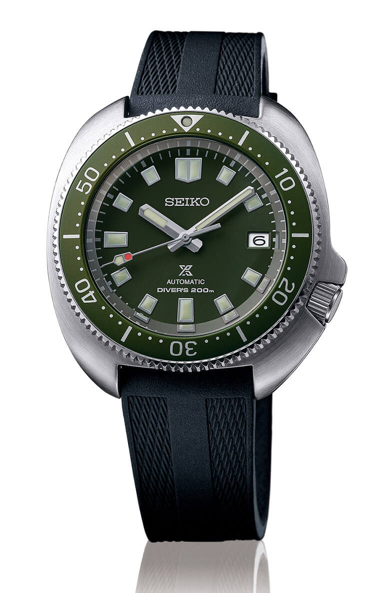 除了三款深具代表性的復刻潛水錶,SEIKO同時也回顧了1970年所推出的自動潛水錶,並專程復刻現代詮釋版,復刻新款共有兩色,包括黑面與綠面。Prospex 1970復刻現代錶款具備圓潤的鮑魚殼,也擁有200米的防水性能。錶款將錶冠設置在4點鐘位置很有SEIKO的特色,同時錶冠兩側的護肩還呈現不對稱設計,既有特色也很有時代美感,獨樹一幟的外型被錶迷們暱稱為「海龜」。