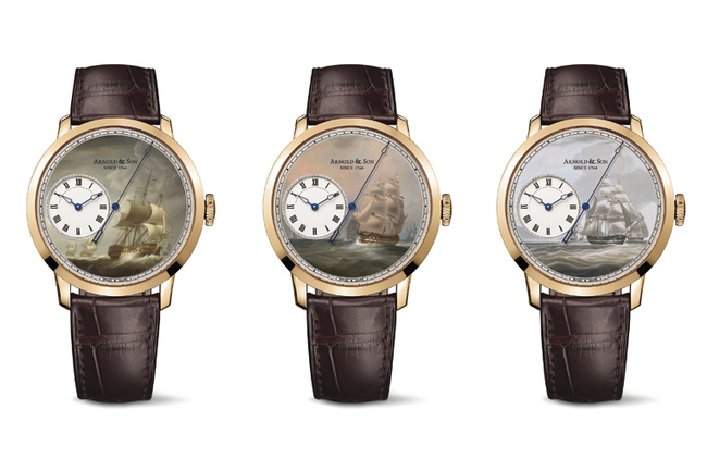 東印度公司在歐洲、美洲、印度及中國貿易擴展時獲益, 成為最強大及著名的貿易王國。其優勢獲重裝如英國皇家海軍的貿易商船所支援著。現在,亞諾錶以這套紀念手錶揭示三重秒跳的時計,錶面飾以仿效英國國家海事博物館裡三幅畫作的精細人手微型繪圖,極講究無盡的耐性及完美的技術。細膩的筆掃和質感, 配合用上貝母製成的錶面,光影反射效果豐富並構成整個畫面,再次突顯亞諾錶在裝飾藝術方面的優秀。