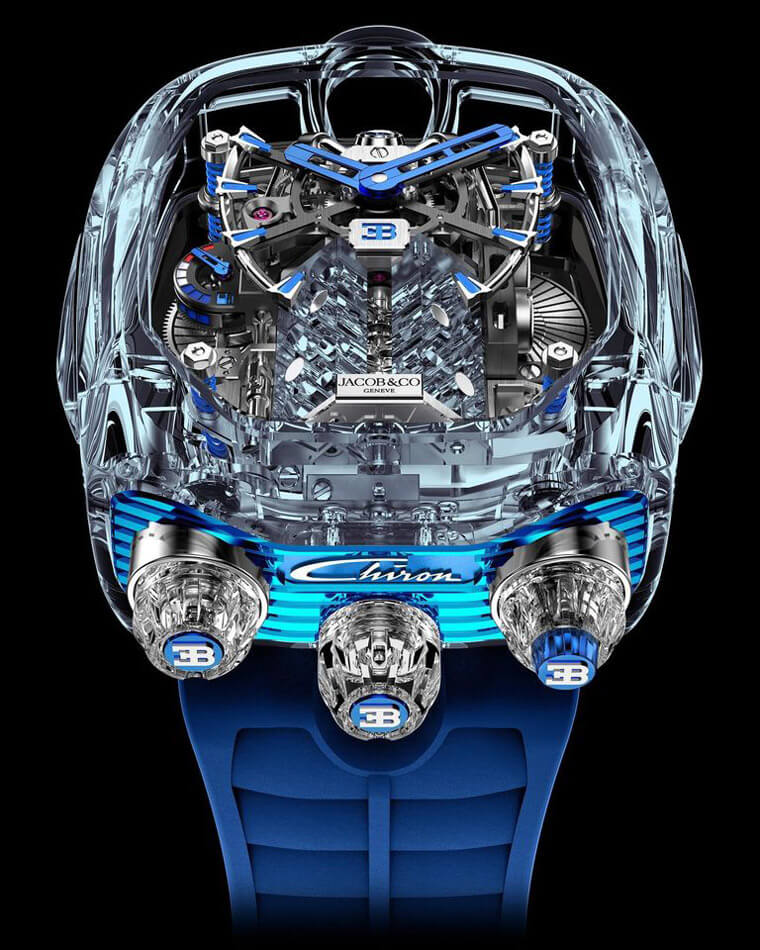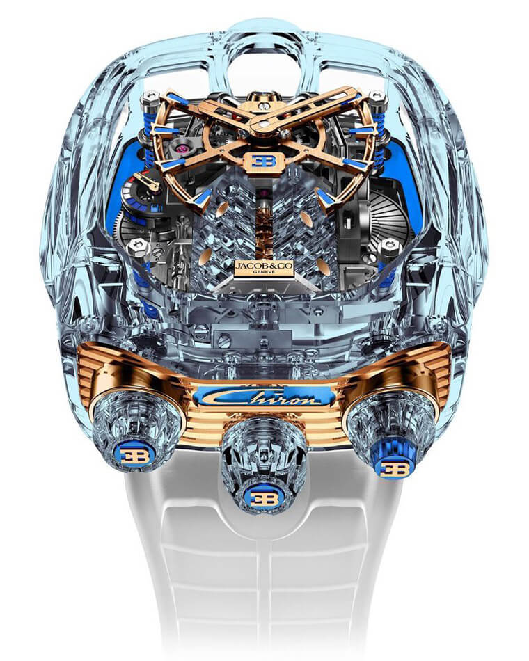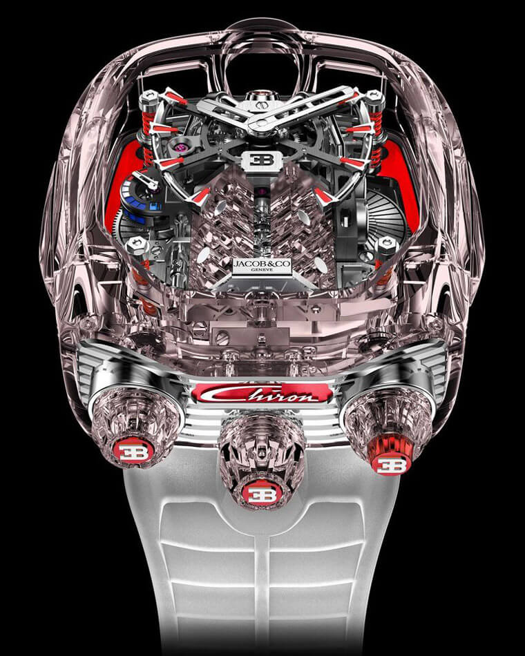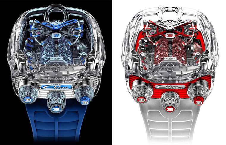 與一般的透明錶殼有所不同,JACOB & CO.並非完全採用透明無色的藍寶石水晶,新款Chiron Tourbillon一共推出數種版本,有的是以透明藍寶石為主,另在面盤下半部的仿W16引擎裝置表面採用紅色藍寶石、有的是整枚錶殼都呈紅色透明或是藍色透明,還有一款是錶殼為無色藍寶石水晶、鏡面和按把則是藍色藍寶石水晶,此外這些新款都有別於鈦金屬版本,在錶殼下方的三枚按把區域採用顏色比較跳的飾板如銀色、紅色或玫瑰金色等等,同時偏心時、分盤的組件也跳脫深黑色系的框架,加上部分機芯夾板也電鍍上紅色或藍色等,讓手錶的視覺效果變得更狂放。從中也會發現JACOB & CO.稍微調整了面盤側零件的造型,如透明殼就多了時標環、動儲顯示的造型也經過修改,另外發條盒頂部的蓋板也都長得和鈦金屬款式的凱龍陀飛輪有點不同。