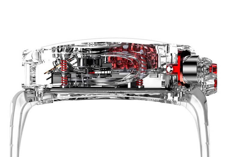 市面上的透明錶殼款式現在愈出愈多,但這種材質的加工難度相較傳統的金屬還是高出一截,因此所謂透明錶殼變多只是跟幾年前市場還很少這種類型的時期相較,整體而言錶壇的透明殼手錶相對還是很稀有。JACOB & CO.原本在Grand Complication Masterpieces系列中就很常採用錶側結合藍寶石水晶材質的設計(就跟剛出道的Chiron Tourbillon一樣),然而這次凱龍陀飛輪並非品牌第一次打造全透明殼的作品,先前在Astronomia Flawless等作品上品牌就已經展現出他們研發透明錶殼的Know-How了,不過相較於Astronomia Flawless渾圓的錶殼,Chiron Tourbillon那源自超跑的特色造型在製作加工時的難度應該也跟著提高了。