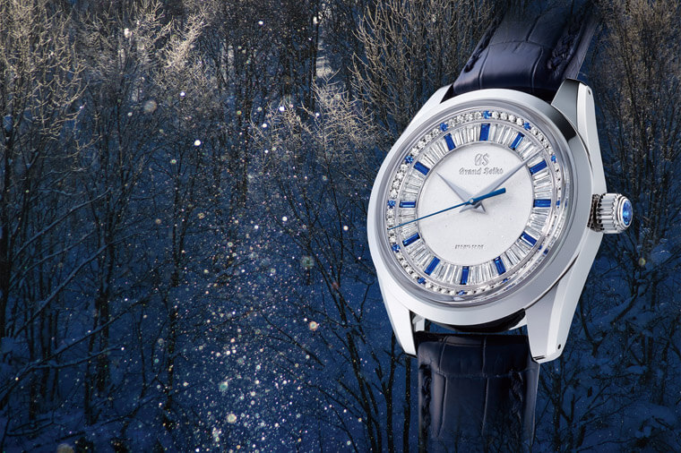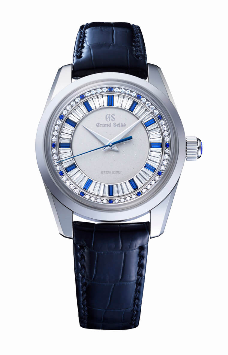 至於GRAND SEIKO台北101旗艦店有哪些焦點新品呢?包括品牌旗下首款珠寶錶,其採用鉑金錶殼,設計靈感來自信州冬日早晨的景色,因此在面盤上會看到猶如冰晶的鑽石沙紋理,同時品牌也在面盤外圍鑲嵌了梯形鑽石與藍寶石,兩者分別擔任時標與分鐘刻度的任務。這珠寶錶款搭載的是Spring Drive 八日鍊9R01機芯,由透明底蓋可以看見機芯橋板以富士山輪廓為靈感的一體成型輪廓,機芯的精準度達每月±10秒誤差,相比機械錶的走時準度更優。這款錶全球只發行10只,台灣也就爭取到那麼1只的配額。