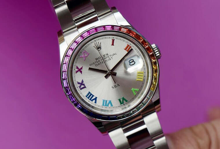 改裝後的樣子如第一張圖片所示,變得和我們印象中的Datejust差很大,首先會先注意到的就是它那騷包的彩虹寶石錶圈,勞力士原廠目前有出彩虹圈的系列也只有Daytona而已,有鑒於現在彩虹圈的高人氣,間接也吸引錶主想要讓自己的Datejust能擁有類似的配備,因此WILDMAN便從善如流地替手錶的錶圈逐一鑲上了彩色寶石。