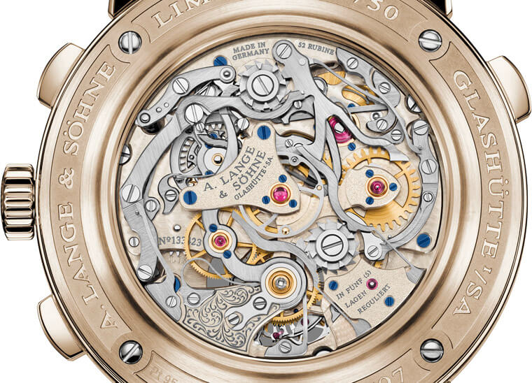 連接萬年曆與追針計時裝置對工程師來說是一項特別的挑戰。因為在使用計時功能和日曆顯示切換時,必須避免組件間產生衝突,以及可能對速率穩定性造成負面影響的振幅波動。朗格憑藉多年來開發高度複雜計時腕錶的經驗得以解決以上難題。頂部的藍鋼追針(或雙追針)可以獨立於鍍18K金計時指針而停動,再透過10時位置的按鈕與之重新同步。這樣,在計時的過程中,可隨意停止多次分段計時。機械切換過程由兩個導柱輪控制,並可透過藍寶石水晶玻璃底蓋即時欣賞其美態