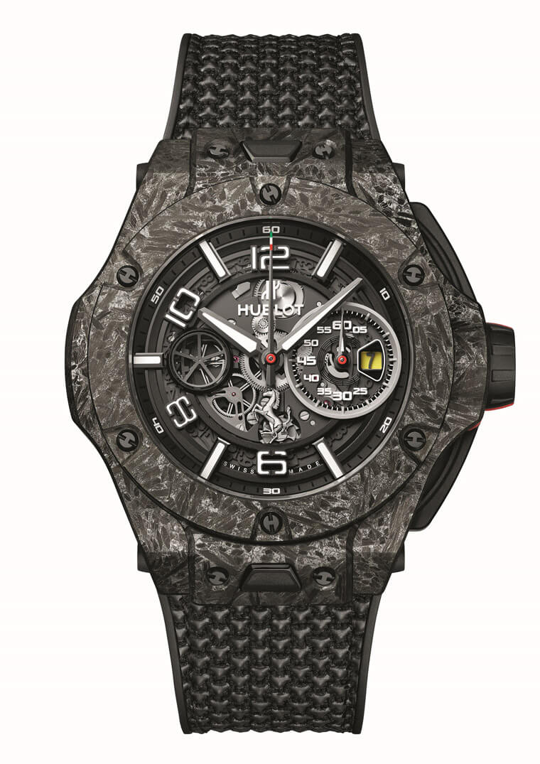 碳纖維陶瓷材質/UNICO HUB1243自動上鍊機芯/時、分、小秒、日期顯示/計時碼錶功能/藍寶石水晶鏡面、透明底蓋/防水100米/錶徑45mm/限量20只/參考價:NT$ 1,635,000