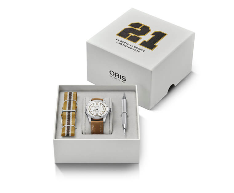Roberto Clemente限量錶採用特殊錶盒包裝,白色外盒可見這位棒球傳奇的21號背號,至於內容物除了手錶之外,還包括證書、含帶扣的Nato錶帶以及錶帶更換工具等,讓佩戴者可以隨意更換自己喜歡的造型。