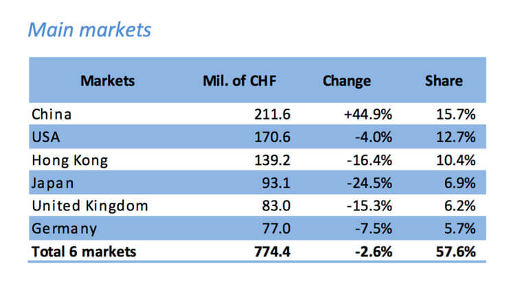 2020年8月瑞士手錶的前六大主要出口市場名單與上個月保持不變,唯有第四名和第五名的日本和英國排名互換,從瑞士手錶輸出到六大出口市場的出口額來看,目前瑞士手錶面臨的情況還是很艱困。前六大市場中還是只有中國一枝獨秀,該國已經連續三個月都表現出大幅的成長,如2020年8月瑞士手錶輸往中國的出口額依舊高達2億1160萬瑞郎,與2019年同期相較成長將近45%,根據瑞士鐘錶工業聯合會(FH)的推斷,這還是跟中國消費者因為無法出國而增加在國內消費的頻率有關。另外美國經過災難性的5月和6月後,最近兩個月的表現開始止跌回升,繼2020年7月出口額比例降至不到-1%水準後,2020年8月還是保持在-4%的平穩表現,相較其他國家,美國在2020年前8個月的瑞士錶出口額整體表現為-24.2%,看起來有點驚人,但其實這跟全球各國市場的平均跌幅是接近的,並不算跌得特別兇。