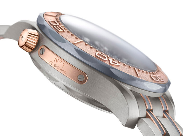 新款海馬潛水300米計時碼錶分別使用了鈦金屬、18K Sedna™金與鉭金屬製成錶殼,其中錶圈、按把、錶冠與排氦閥都是用Sedna™金製成,而錶圈上的計時刻度則是用雷射陽刻而成,此外錶殼左側也還鑲飾有一枚Sedna™金材質的錶號銘牌。