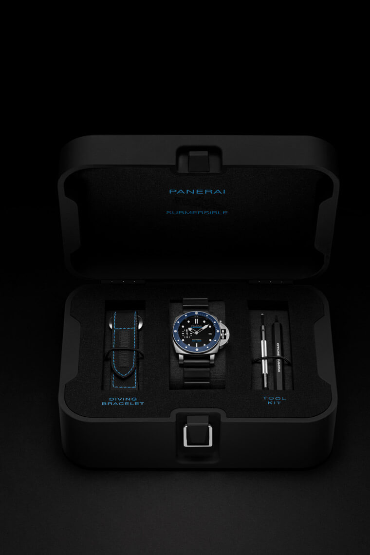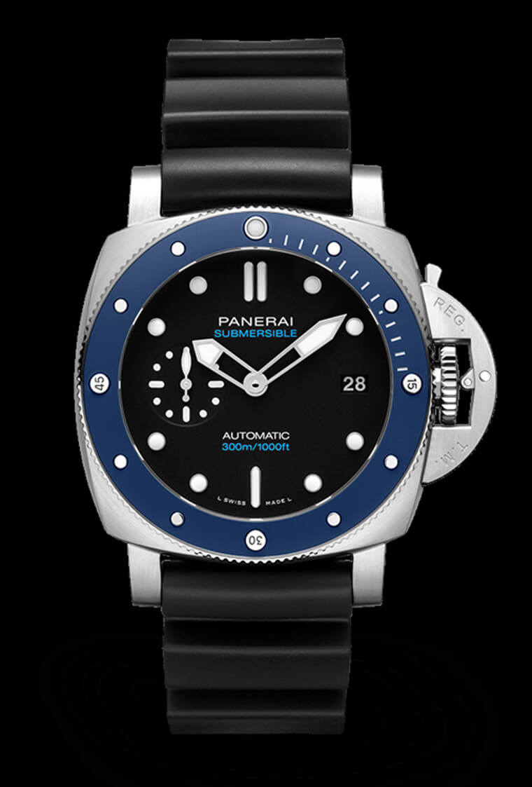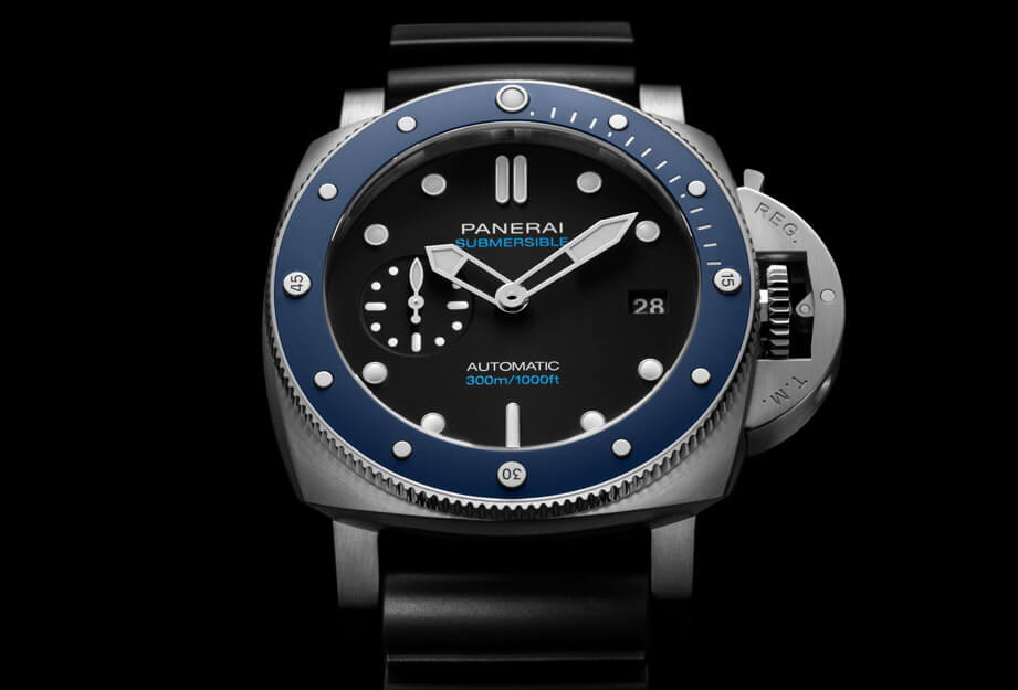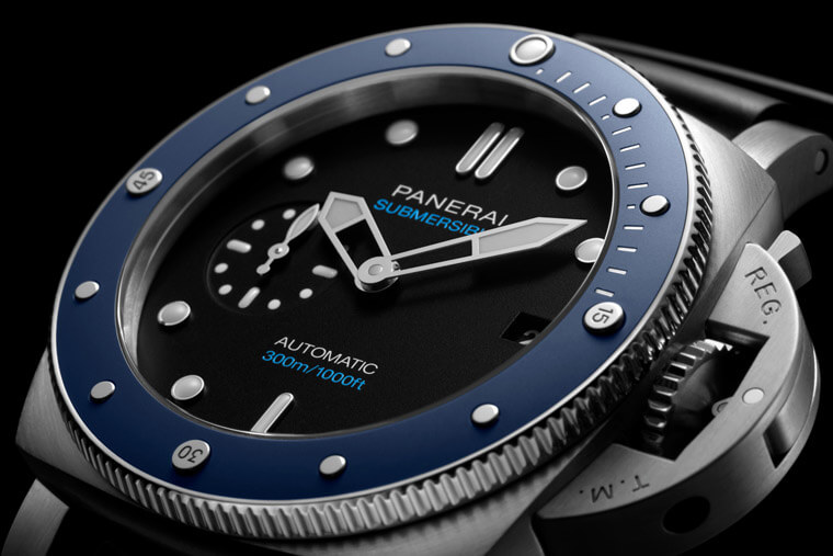 PANERAI沛納海的Submersible系列由於有單向旋轉計時圈這種潛水錶獨有的裝置,也因此讓錶款多了一個可以讓品牌揮灑創意與科技的地方。綜觀目前Submersible系列的潛水錶,除了有與錶殼相同的鈦金屬或不鏽鋼錶圈,尚有Carbotech、BMG-Tech™等科技材質製成的錶圈,至於沛納海還有一種最常用來搭配錶殼的科技材質要屬陶瓷錶圈,而過往Submersible系列的陶瓷錶圈往往以黑色為大宗,不過近年從Guillaume Néry聯名款以來品牌開始引進相對少見的藍色陶瓷錶圈,2019年也持續新增藍色陶瓷這款不鏽鋼錶殼搭藍色陶瓷錶圈的小三針作品PAM00959,以上這兩款都是灰面設計,直到最近沛納海才終於推出藍色陶瓷圈搭配黑面的新款Submersible Azzurro PAM01209。