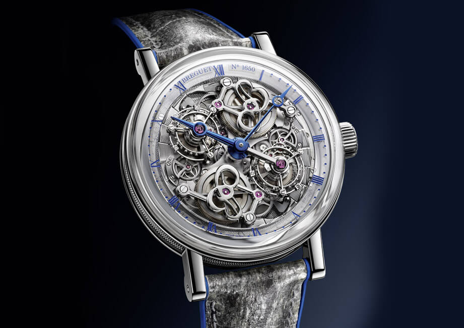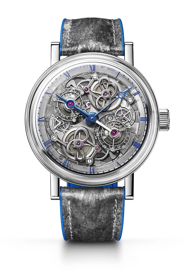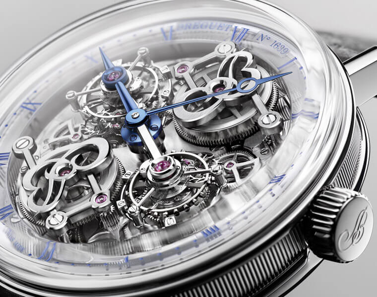 手錶的主角——雙陀飛輪圍繞面盤軸心運行,每12小時會旋轉一圈,兩枚陀飛輪皆為一分鐘旋轉一圈。如此,連結陀飛輪的調節裝置會運轉兩周,而此陀飛輪支架剛剛可便延展成為手錶的藍鋼時針之用,另外搭配同樣經過藍鋼處理的寶璣式分針,兩枚藍色調指針在銀灰色機芯零件的烘托下能夠清楚顯時,同時陀飛輪本身運作的動態之美甚至比起閱時更能引起佩戴者的目光。
