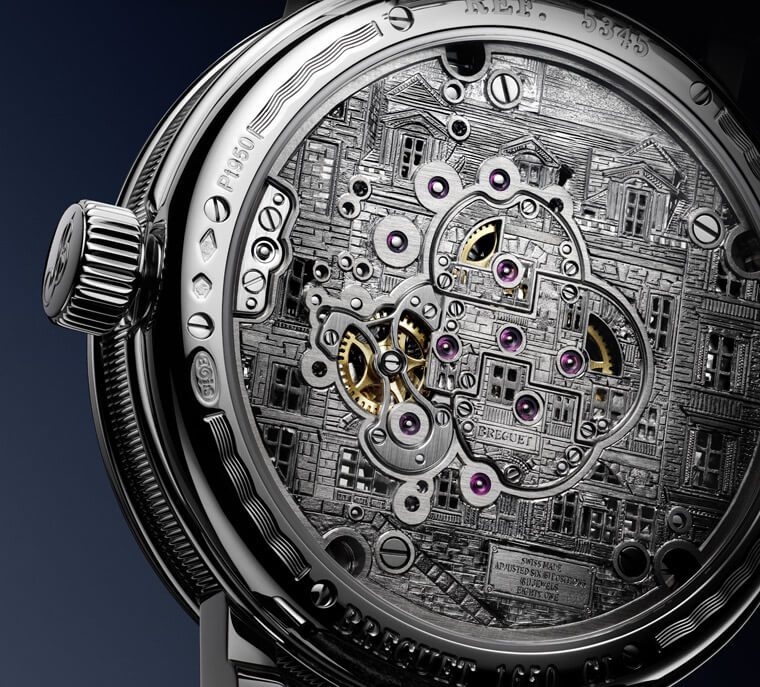 ▲底蓋手工雕刻圖案乃是刻畫寶璣大師當年在巴黎鐘錶堤岸(Quai de l'Horloge)所開設的製錶工坊。