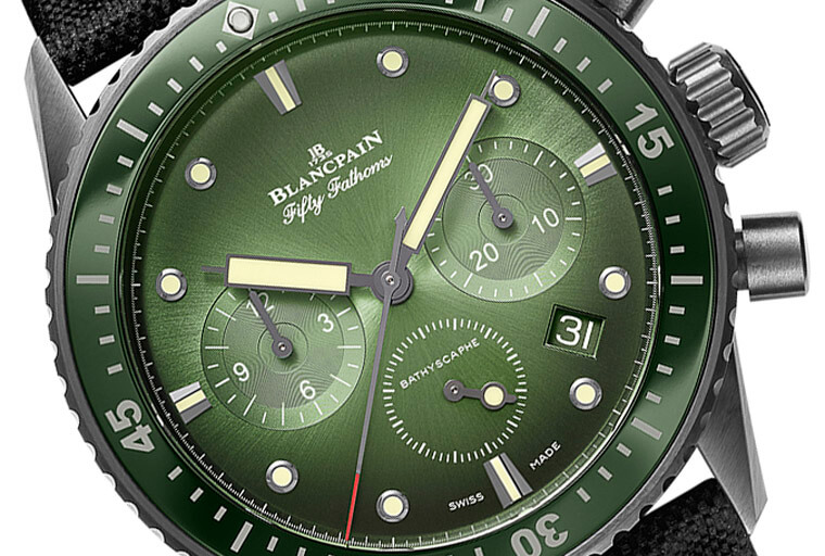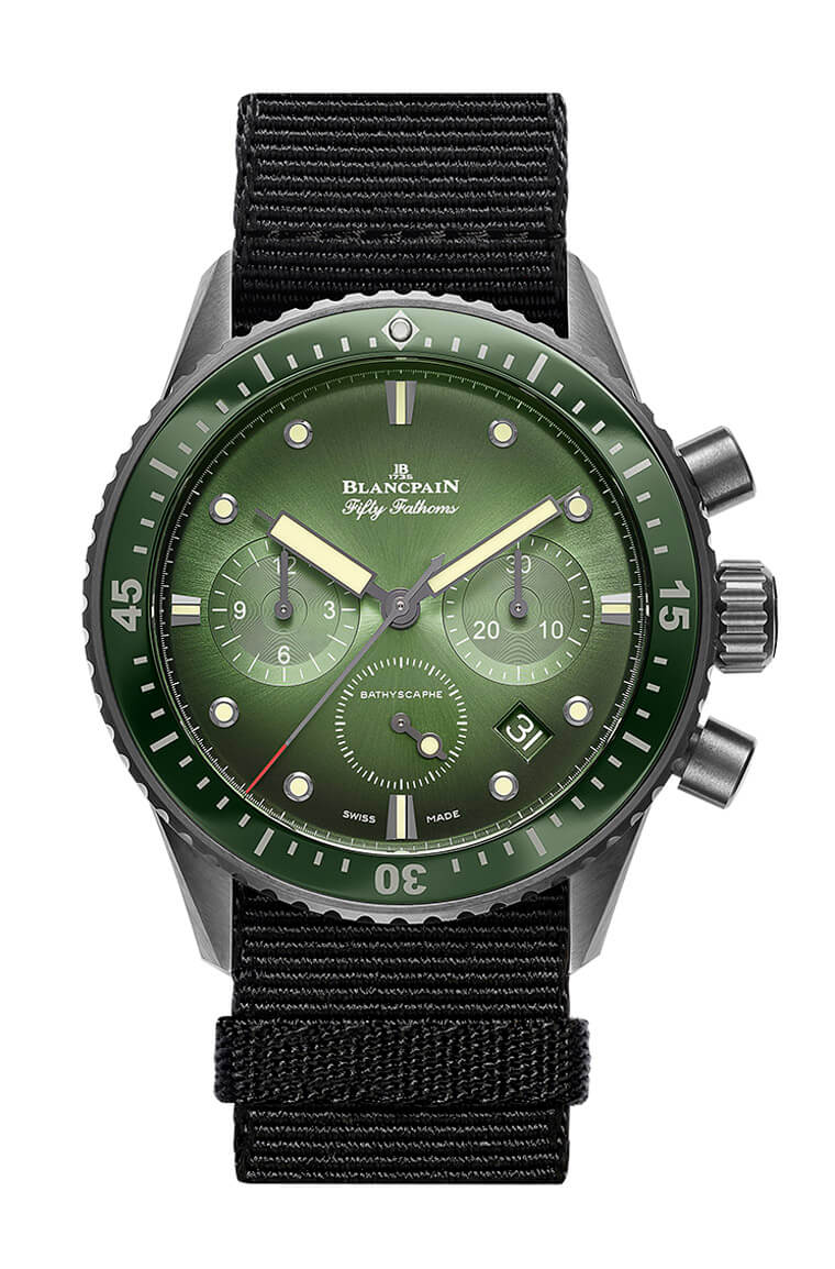 另款Bathyscaphe計時碼錶讓人想起了「心繫海洋」限量版,因為它再次出現了五十噚家族中罕見的綠色面盤,而且新款的功能比起「心繫海洋」限量版的大三針顯然又再更上層樓了。Bathyscaphe計時碼錶與「心繫海洋」限量版同樣採用陶瓷材質錶殼,甚至兩者的錶殼尺寸也相當,還有錶圈也都是寶珀罕見的綠色陶瓷圈。