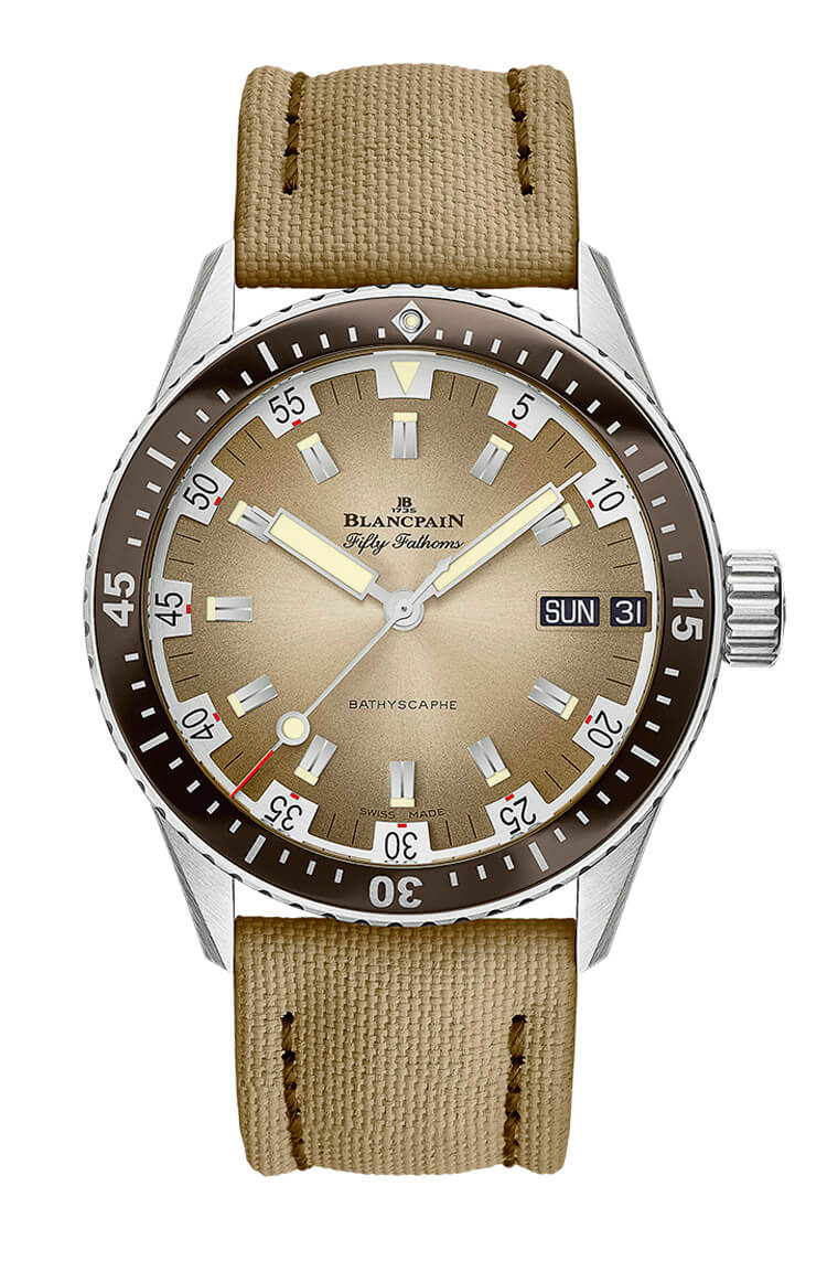 首先在Bathyscaphe日期星期手錶部分,這款的基礎為寶珀數年前才剛推出以1970年代潛水錶為藍本的復古風格作品,43mm錶殼以不鏽鋼材質製成,搭配棕色陶瓷圈提供更耐刮且不會褪色的正面保護效果。手錶還配置了沙黃色的帆布錶帶,感覺好像多了點軍用風格的味道。