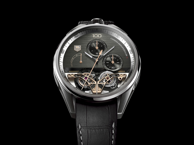 TAG HEUER Carrera MikroPendulumS概念手錶是MikrotourbillonS計時錶的升級版本,裝配兩個磁力Pendulums擺輪代替傳統的游絲擺輪,其一用於指示時間,其二用於計 時。機芯由454個零件組成,擁有TAG HEUER獨家專利技術,走時擺輪擺頻為12赫茲, 計時擺輪擺頻為50赫茲——即每小時360,000次(60分鐘動力儲備),每分鐘旋轉12圈;此陀飛輪計時錶乃世上最高速,可精確至1/100秒。