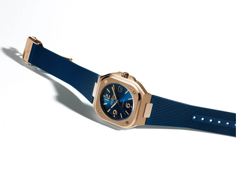 BR05 Blue Gold藍色圓形面盤格局簡潔俐落,易讀性高,大小適中的錶徑以及實用的功能都令人滿意,這系列原本就希望呈現更濃的都會雅痞性格,此次結合貴金屬以及優雅的藍色面盤,無疑能替系列抓住更多手錶愛好者的目光。