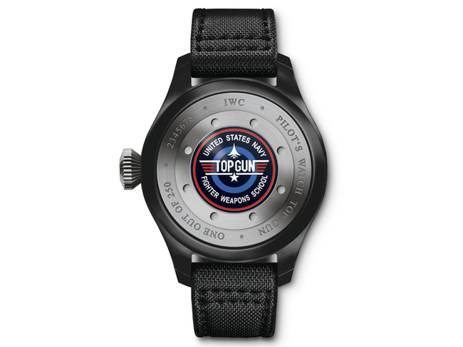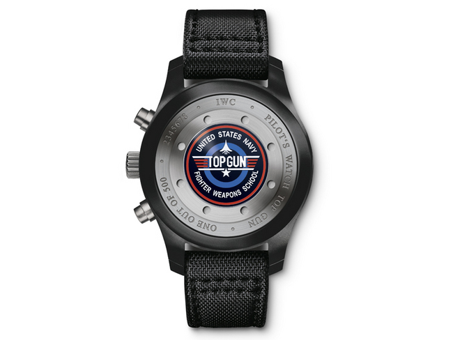 ▲ 飛行員系列Top Gun海軍空戰部隊計時手錶專賣店特別版(型號IW388003)的錶底鐫刻有精美Top Gun徽章圖案,限量500枚,其一流水準令人毋庸置疑。