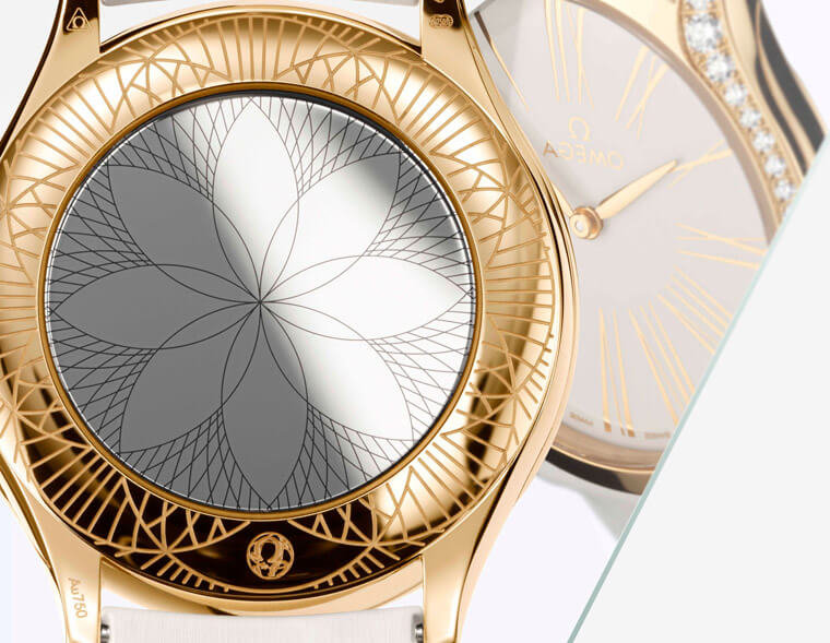 新款碟飛Trésor女錶依舊分為36和39mm兩種尺寸,它們的外觀特徵也不變——在錶殼曲線兩側共鑲嵌多達38顆美鑽。錶冠的紅色液態陶瓷歐米茄花朵圖案中還會發現額外一顆鑽石妝點。錶款由於搭載的是石英機芯,因此錶背採用實底蓋設計算是業界常態,不過碟飛Trésor女錶可不像一般金屬實底蓋那麼無聊,歐米茄除了在底蓋與底蓋邊緣刻上「Her Time 她的美麗時光」花朵紋理設計,底蓋表面還經過鏡面拋光,猶如一面隨身的小鏡子,在急需的時候就能派上用場。