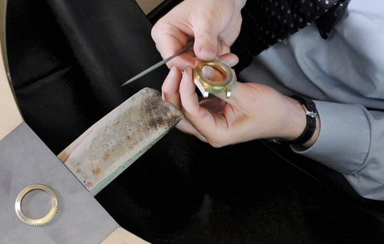 ▲製錶師使用傳統機具對錶殼進行細部修改。