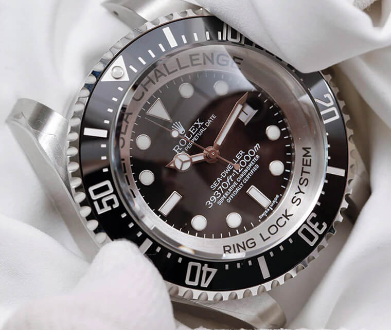 那就是大導演詹姆士柯麥隆(James Cameron)在2012年進行深海挑戰任務時所戴去一塊進行冒險的 Deepsea Challenge手錶,當時詹姆士柯麥隆成功創下搭乘單人潛水器到達挑戰者深淵(海平面下10,898米,為目前地球已知最深處)的紀錄,而手上的Deepsea Challenge則是證明了手錶可以被戴到水下這麼高壓的地方還能安然無事的好品質。這款Deepsea Challenge雖然沒有市售,但是勞力士當初在製作給柯麥隆時可是超神速完成,據品牌表示,這款手錶從零開始到製作成特製款給柯麥隆的時間不到一個月就完成,而且手錶做完數個禮拜後就被柯麥隆戴去挑戰者深淵,雖然這不是勞力士研發手錶的標準流程,但卻也顯露出他們就算在時間壓力下,還是能做出品質經得起考驗的成品,而後來品牌則是2014年於海使系列中新增Deepsea “D-Blue”這個款式來紀念柯麥隆完成的創舉,算算時間也已經過了2年。