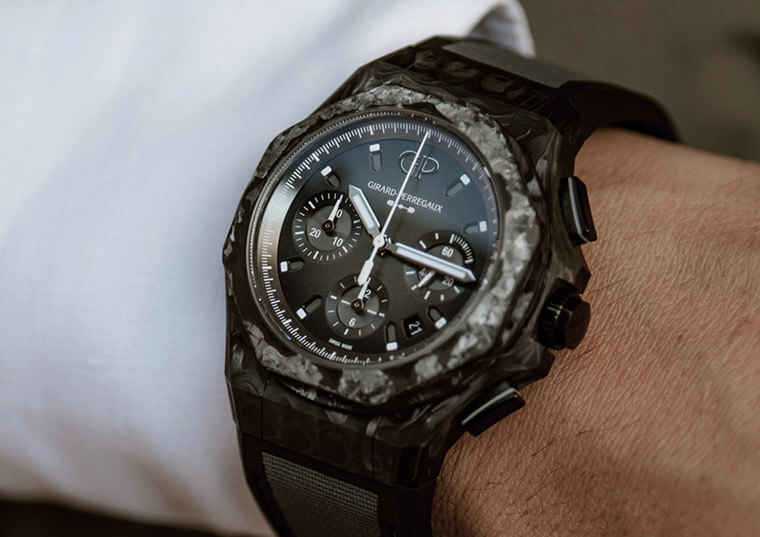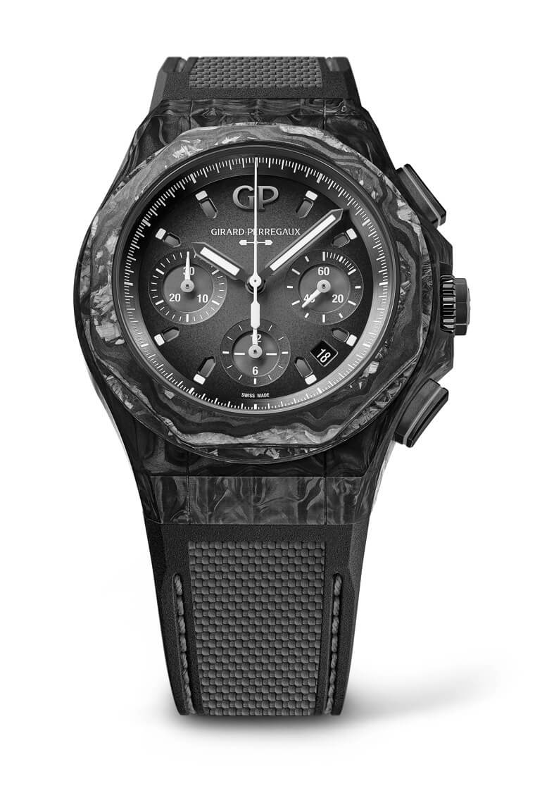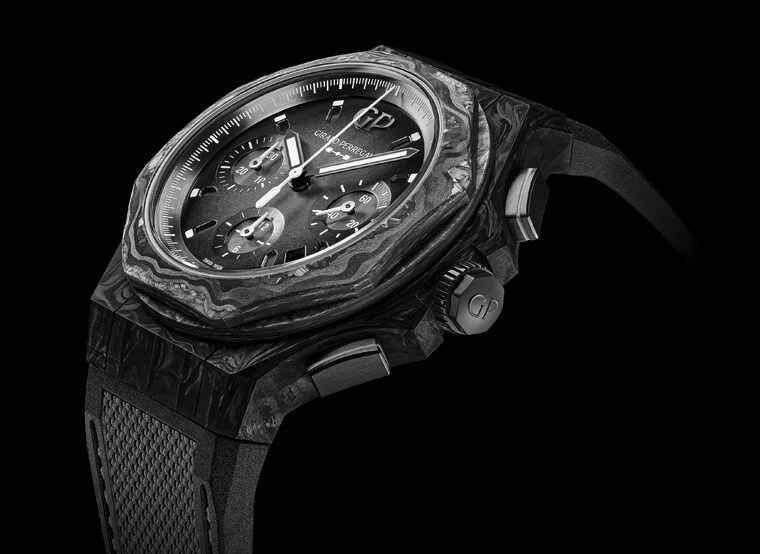 玻璃碳材質/GP03300-1058自動上鍊機芯/時、分、小秒、日期顯示/計時碼錶功能/藍寶石水晶鏡面/防水50米/錶徑44mm/限量100只/參考價:NT$ 545,000