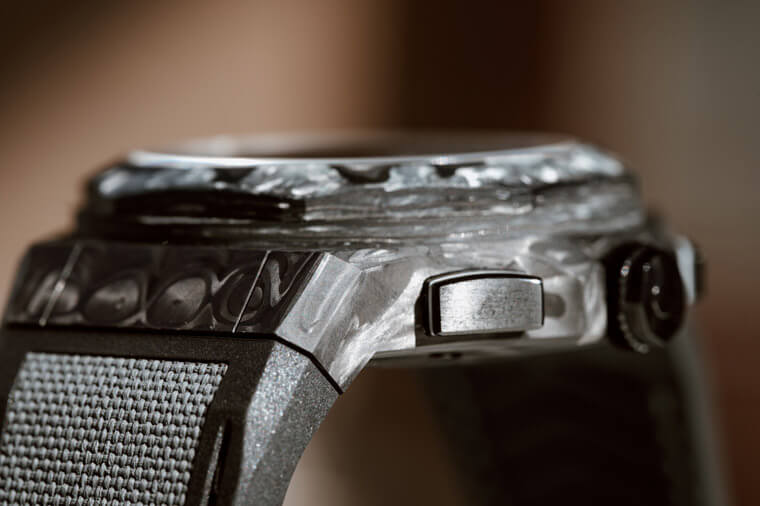 Absolute Crystal Rock計時碼錶直徑達44毫米,錶殼採玻璃碳材質。這種少見材質的特性在於既堅固又輕盈——錶款的重量僅為94克,佩戴在手上頗感輕鬆。這種高科技材質是由一層層碳纖維和玻璃纖維在高溫和高壓條件下鍛造,混合一體並將之塑形。因此錶殼表面呈現出一種霧面且略帶紋理的質感,而且這種特別紋路的另一個隱形優勢在於因為紋路本身都是隨機產生,所以每只錶錶殼採用的玻璃碳紋路也不會完全一樣,即使戴的是同款錶,還是可以展現同中求異的自我風格。
