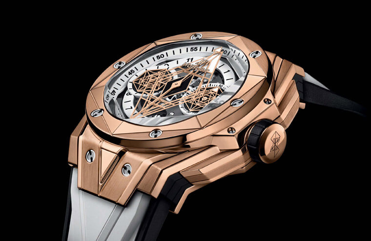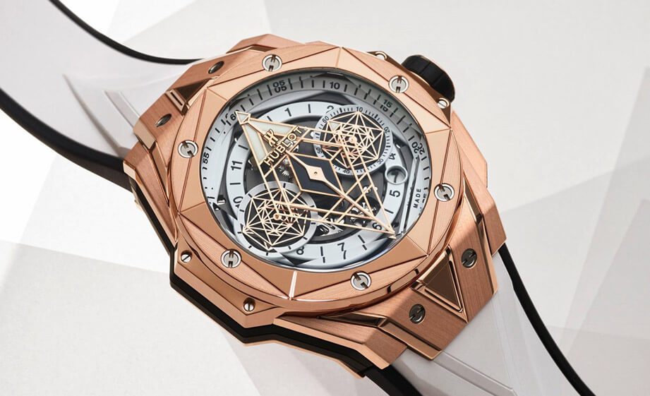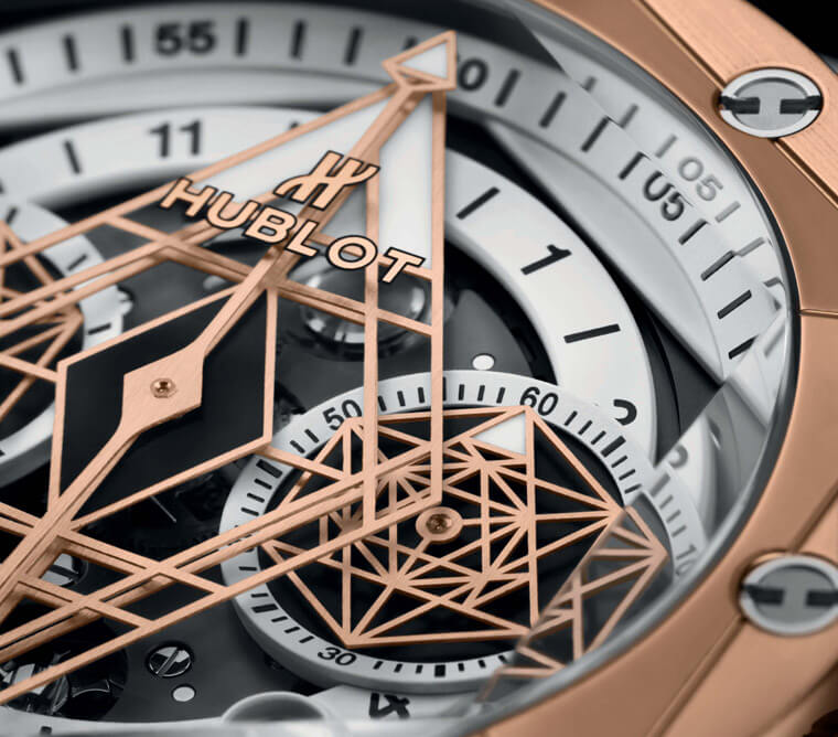 擁有多切面的錶殼外觀只是手錶讓人感到的驚豔的一部份,其開面式的面盤結構露出底下乘載Unico機芯的局部樣貌,這枚宇舶招牌計時機芯震頻為錶壇主流的4Hz,動力儲存也達到高實用性的3日鍊水準。面盤特別之處在於宇舶延續錶殼的設計思維,以鏤空的幾何矩陣分別指示分鐘、小秒以及分鐘計時資訊,跳脫傳統手錶的設計展現手錶蘊含的高度創意。