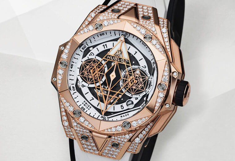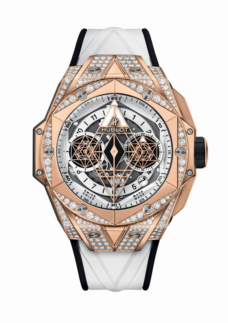 18K皇金材質/UB1240 MXMUnico自動上鍊機芯/時、分、小秒顯示/計時碼錶功能/錶款鑲鑽48顆/藍寶石水晶鏡面、透明底蓋/防水100a米/錶徑45mm/參考價:NT$ 2,057,000
