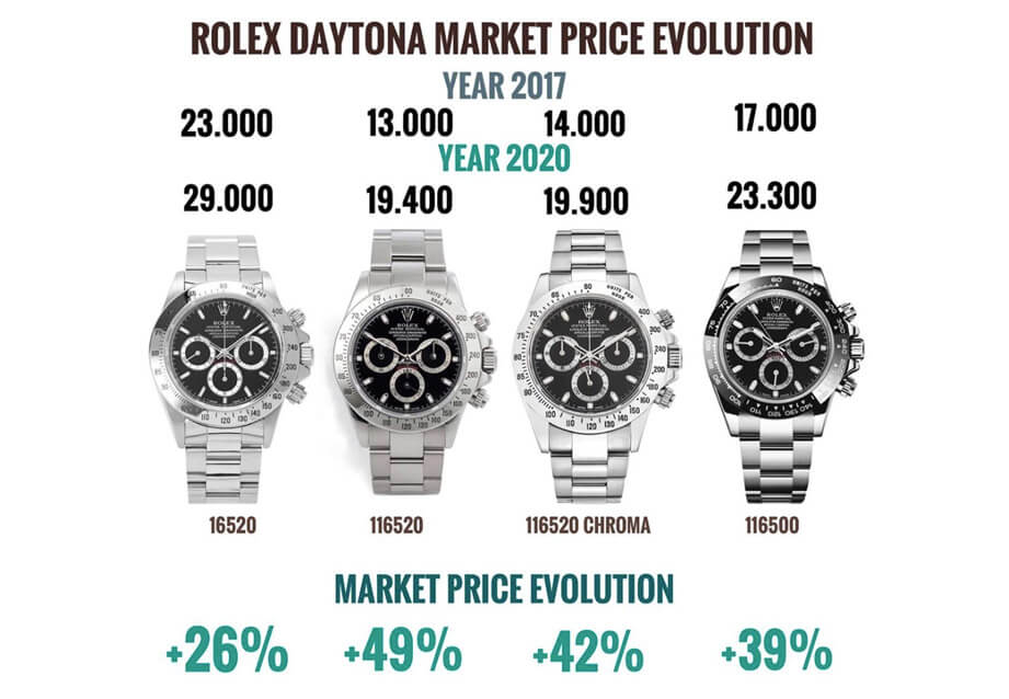 ▲外媒列出四款超人氣鋼殼Daytona 2017年與2020年的市場價格對照圖,共同特徵是它們三年前後的價格全面上漲,而且漲幅都不小。Source:Instagram @passion_luxury_watches