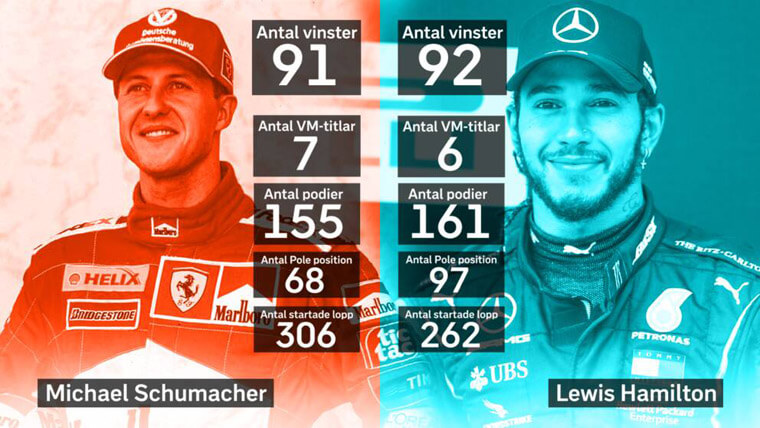 不過值得注意的是,舒馬克雖然花了更長的賽季才拿到91場勝利,但若比較兩者分別獲得91場勝利的出賽場次,那麼舒馬克只花了247場就贏得91場勝利,以勝率而言依舊優於漢米爾頓出賽第261場才摘下91勝。而漢米爾頓在贏得葡萄牙大獎賽,本季個人於車手榜的積分也上升到256分,在本季最後五站中只要不出什麼大意外,基本上漢米爾頓獲得個人生涯第七座車手冠軍的機率相當高,一旦他再度拿下車手榜冠軍,這個累積的次數記錄也將再次追平舒馬克的另一個神話紀錄,展望來年漢米爾頓又有機會可以締造自己現代車神的精彩史頁。