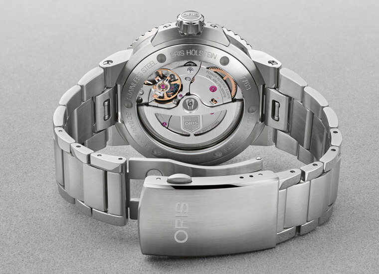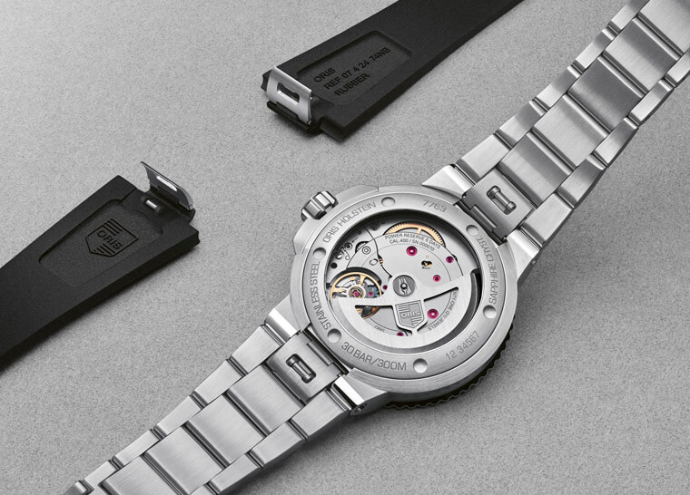 延續Calibre 110家族的傳統,ORIS近年針對自製機芯都採用透明底蓋設計以展現得之不易的工藝研發成果,Aquis Calibre 400日期錶比照辦理以透明底蓋Show出下方的Calibre 400機芯,過往ORIS修改通用機芯時習慣在自動盤塗上代表品牌的紅色,然而整個全新設計的Calibre 400並沒有遵循這樣的傳統,反而是將自動盤鏤空,讓佩戴者能夠更清楚觀賞這枚機芯的組成結構。
