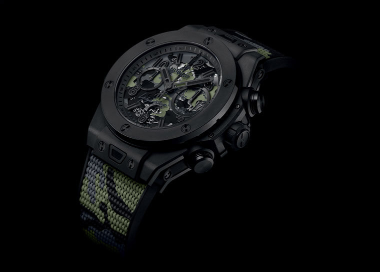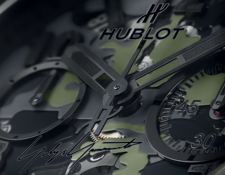 品牌在針對迷彩圖案的表現手法上利用的是獨特的藍寶石疊加印刷,這些不規則色塊包含綠色、灰色與黑色,彼此疊合後形成山本耀司時裝標誌性的迷彩圖騰,此外一如Big Bang GMT全黑山本耀司限量版手錶,這款錶也在面盤6點方向印上了設計師的簽名,不張揚但很直接地點出手錶的聯名對象為何。