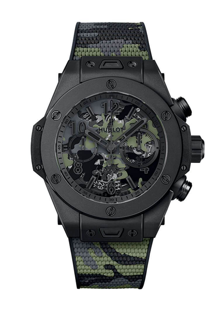 宇舶這次從山本耀司設計的時裝獲得靈感,決定以迷彩圖案作為貫穿手錶外觀的主要元素,使手錶在低調之餘,還多了更豐富的視覺魅力。Big Bang Unico迷彩山本耀司手錶與前作同樣採用黑色陶瓷材質,兩款錶連錶徑也同樣是45mm,不過兩者由於搭載機芯和功能不同,因此新款面盤格局自然也就呈現出截然不同的樣貌。