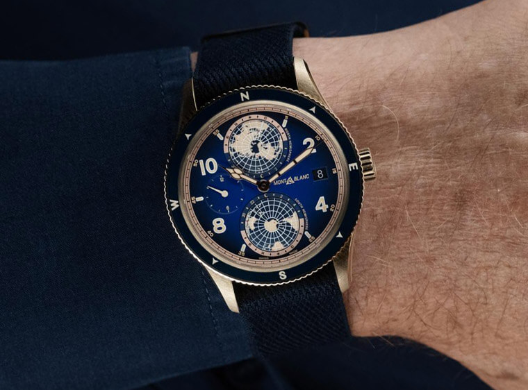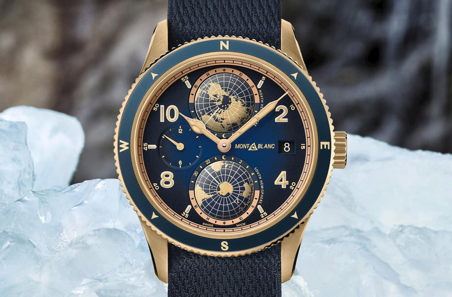 MONTBLANC萬寶龍近年主打1858系列,2020年此系列的設計靈感來自冰川和雪山,因此想當然手錶的設計就會以藍色系呈現,包括1858 Geosphere、1858自動計時碼錶和1858自動錶等作品皆在今年換上沁涼的藍色面盤,以上提到的款式要嘛以鈦金屬製作、要嘛便是不鏽鋼錶殼,品牌最近新推出了一款1858 Geosphere世界時區手錶雖然也是採藍色調,不過它的錶殼卻改用青銅材質,並且採限量發行,原來這是萬寶龍為了向傳奇登山專家Reinhold Messner致敬所推出的特別版。