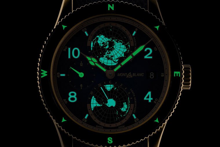 手錶除了面盤的二針加上3點方向的日期視窗外,9點方向也還有著兩地時間顯示盤,如同錶圈四方位,面盤上的細節包括指針、時標、兩地時間指針甚至是球體上的地球圖案都塗有SuperLumiNova®塗層,即使在暗處想要判讀時間也不成問題。