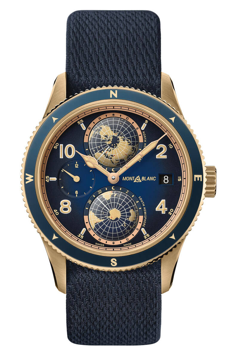 為了向這麼一位探險傳奇人物致敬,萬寶龍遂以Messner版的攻頂清單為靈感,特別為他發表一款限量紀念錶。錶殼採用42mm青銅合金製成,並經過拋光緞面處理。凹槽紋雙向青銅錶圈使用亮面藍色陶瓷,鐫刻四大方位基點,並塗覆Super-LumiNova®塗層。面盤採漸層藍色搭配包玫瑰金與米色細節,營造出冷暖色調高反差的對比效果。