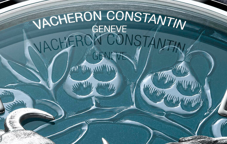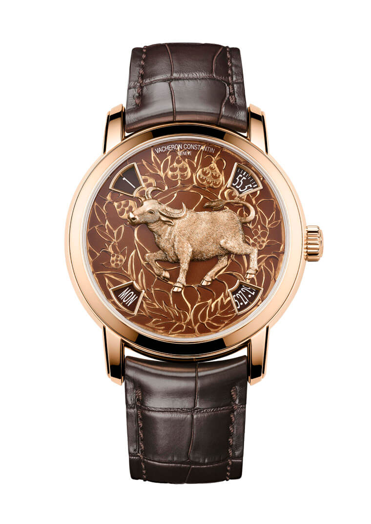 江詩丹頓牛年生肖錶的面盤採用半嵌入式設計將帶有中國風的花卉枝葉金雕圖案置入,接著品牌再於面盤塗上琺瑯釉料,將過攝氏於800~900度高溫反覆燒製多達數層的琺瑯釉料,形成藍綠色(鉑金款)與棕色(玫瑰金款)的琺瑯色彩。除了以上的浮雕與大明火琺瑯工藝,江詩丹頓呈現生肖主題乃是直接明瞭以金雕工藝處理,工藝師分別運用與錶殼呼應的鉑金或玫瑰金材質,雕刻出栩栩如生,連毛皮以及眼神都刻畫得相當到位,一瞬間差點讓人忘了手錶還有判讀時間的功能。