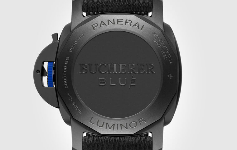 PAM01176的實底蓋也是一片黑,不過考量到有些佩戴者皮膚比較敏感,因此底蓋材質並非陶瓷而是親膚性佳的鍍黑鈦金屬,底蓋與一般Luminor GMT也有所不同,因為上面鐫刻的字樣為”BUCHERER BLUE”,低調地呼應手錶限量288只的特殊收藏價值。