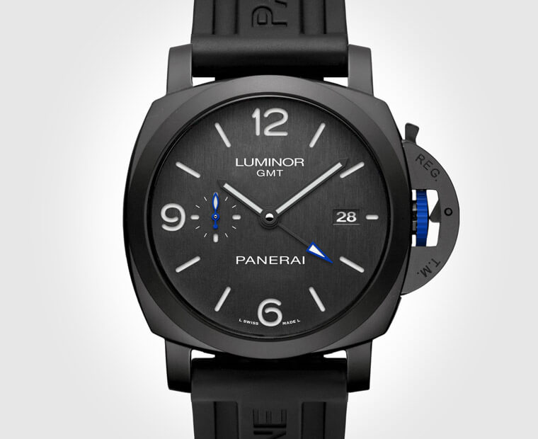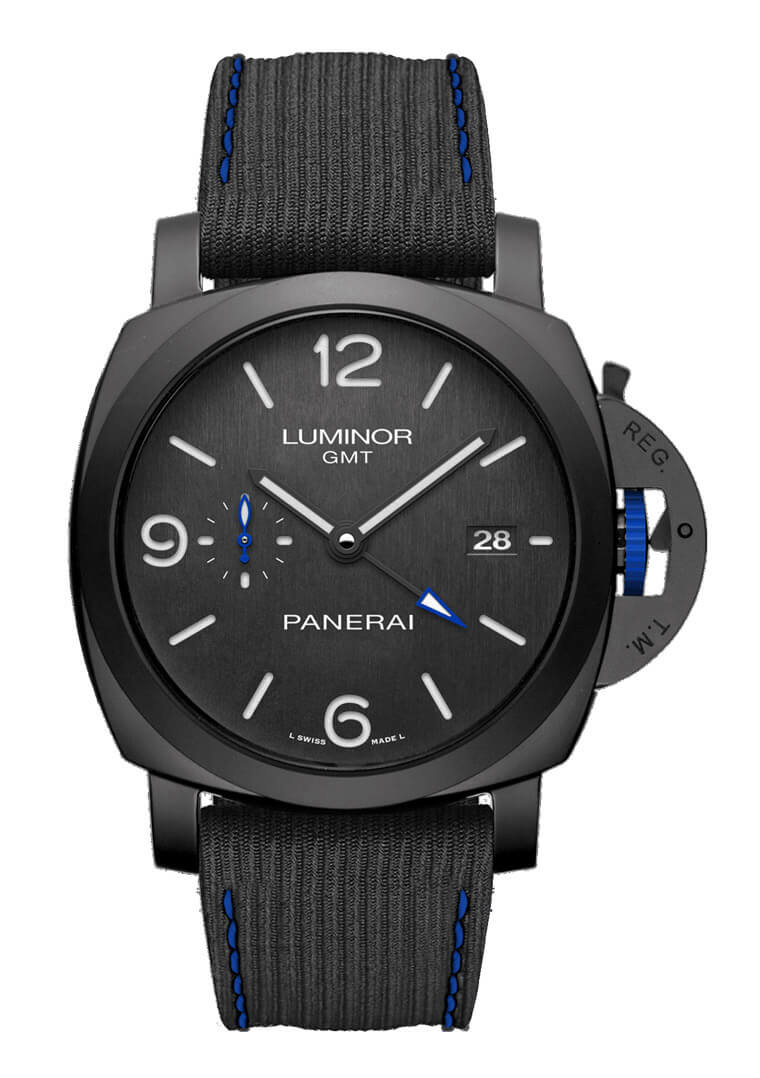 錶款顧名思義是以Luminor GMT為基礎,它採用黑色陶瓷材質,錶徑同樣為44mm,要說手錶第一眼讓人最驚豔的部分大概在於錶冠,沛納海這次採用藍色橡膠包覆錶冠,藍色橡膠在錶殼、錶冠護橋等黑色陶瓷烘托下特別顯眼,這點也是一般市售沛納海手錶不會見到的設計。以橡膠包覆的錶冠除了視覺效果比較獨特,它的止滑效果對於佩戴者要調時間或上鍊時也會產生間接幫助。