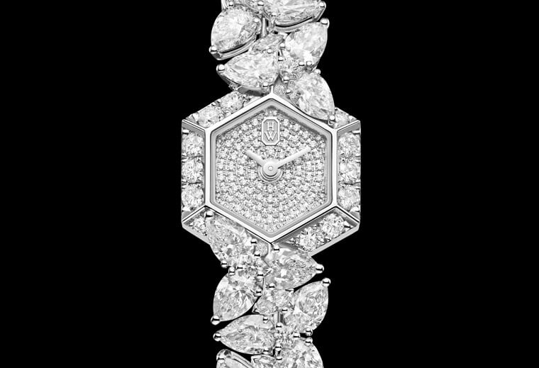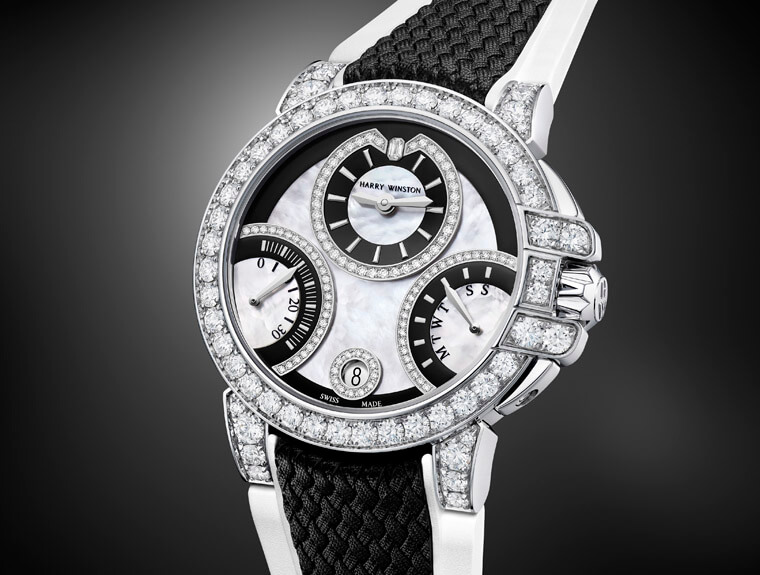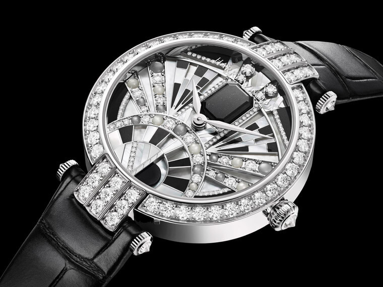 白金錶殼搭配大膽採用黑白色調以及獨特幾何形狀設計的面盤,盡顯絢麗鮮明的當代風格。海瑞溫斯頓於錶款身上搭配黑玉、珍珠母貝和鑽石,層層鑲嵌創造出富有起伏變化的迷人面盤景致。