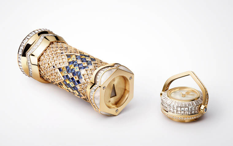 這款作品既是珠寶墜鍊、也是精密時計,更是一款功能齊全的萬花筒。除此之外,它採用黃金材質製成的外殼,精巧地鑲有不同類型的寶石,尺寸為18.75mmx9.83mm,相當便於攜帶。