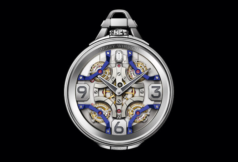 這只懷錶堪稱2020年海瑞溫斯頓頂級珠寶腕錶系列最受矚目之作。懷錶重現品牌位於紐約第五大道旗艦店的拱門造型,面盤之上設有四枚獨立陀飛輪更是氣勢非凡,品牌於12點位置鑲嵌品牌標誌性元素——祖母綠型切工鑽石,目的是要向海瑞‧溫斯頓先生致敬。