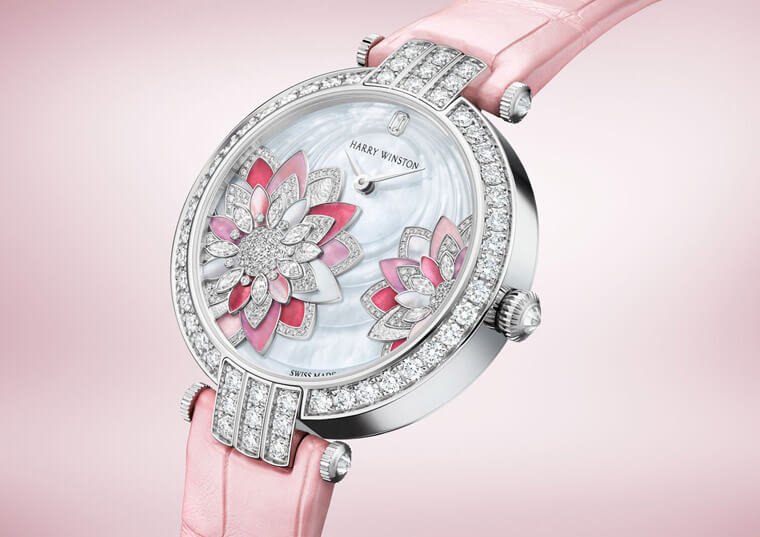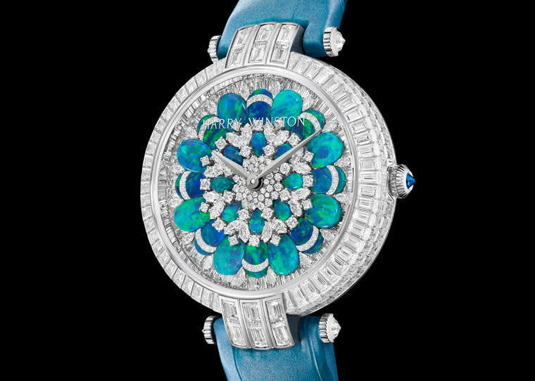 手錶面盤以菊花為主題,海瑞溫斯頓將迷人的蛋白石和耀眼的白鑽巧妙融合,寶石化爲花瓣的設計賦予花卉圖樣一股生氣,也使得手錶寶石不止耀眼,還多了一股自然清新美感。