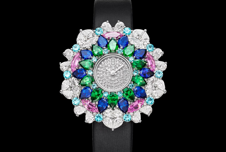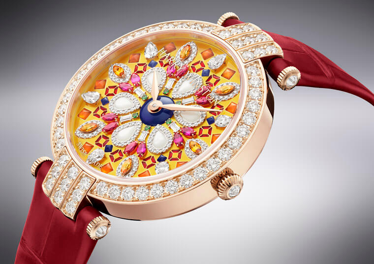 珍貴寶石錦簇鑲嵌於錶殼之上,創造強烈的色彩與對比衝擊。乍看會以為手錶的靈感是花卉,但細看它集結鑽石、帕拉伊巴碧璽、藍寶石、祖母綠、沙弗萊石等彩色寶石,目的正是為了要呈現出猶如萬花筒看到的花花世界景色。