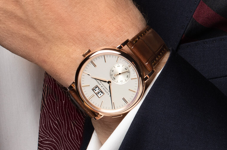Saxonia Outsize Date渾身充滿朗格的傳統風格,例如經過拋光倒角處理的實心18K金嵌塊時標,而大日期顯示更是朗格於1994年回歸現代錶壇後所首度開發的經典設計元素。Saxonia Outsize Date面盤一派簡約清爽,除了時、分二針之外,6點方向為小秒盤、12點方向則是與小秒盤相對的大日期顯示。錶款的K金錶殼直徑為38.5mm,以現代正裝錶標準來看還算剛好,同時它的錶殼厚度也控制在9.6mm的程度,佩戴在手上也顧及了舒適度。