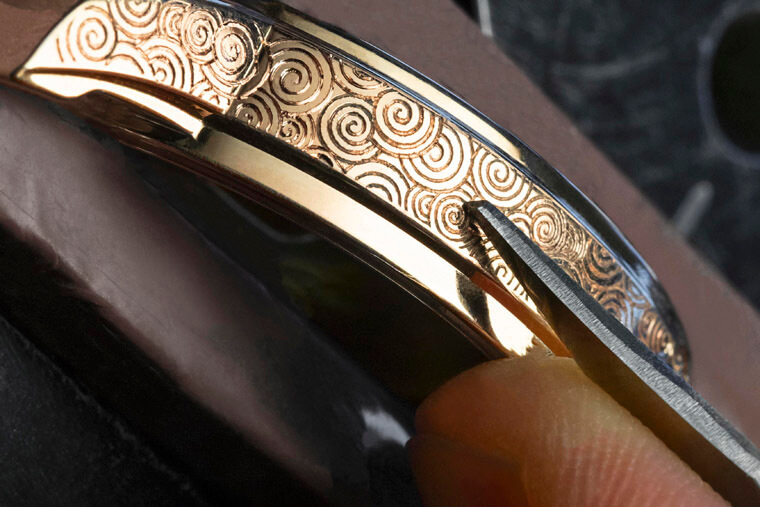 目光移到面盤上,江詩丹頓在手工機刻雕花的鍍黑盤面上鑲上兩隻麒麟圖案。這種浮凸雕飾(ramolayé)工藝乃是透過細緻的切鑿、銼削和軟化工序,令圖案呈現出浮凸有致的立體感,工藝師在製作過程中會用到小石子、刷子、紙張或杵刀等工具,重點是這些工具並非制式化生產,而是由工藝師適自己的需求所自行打造。