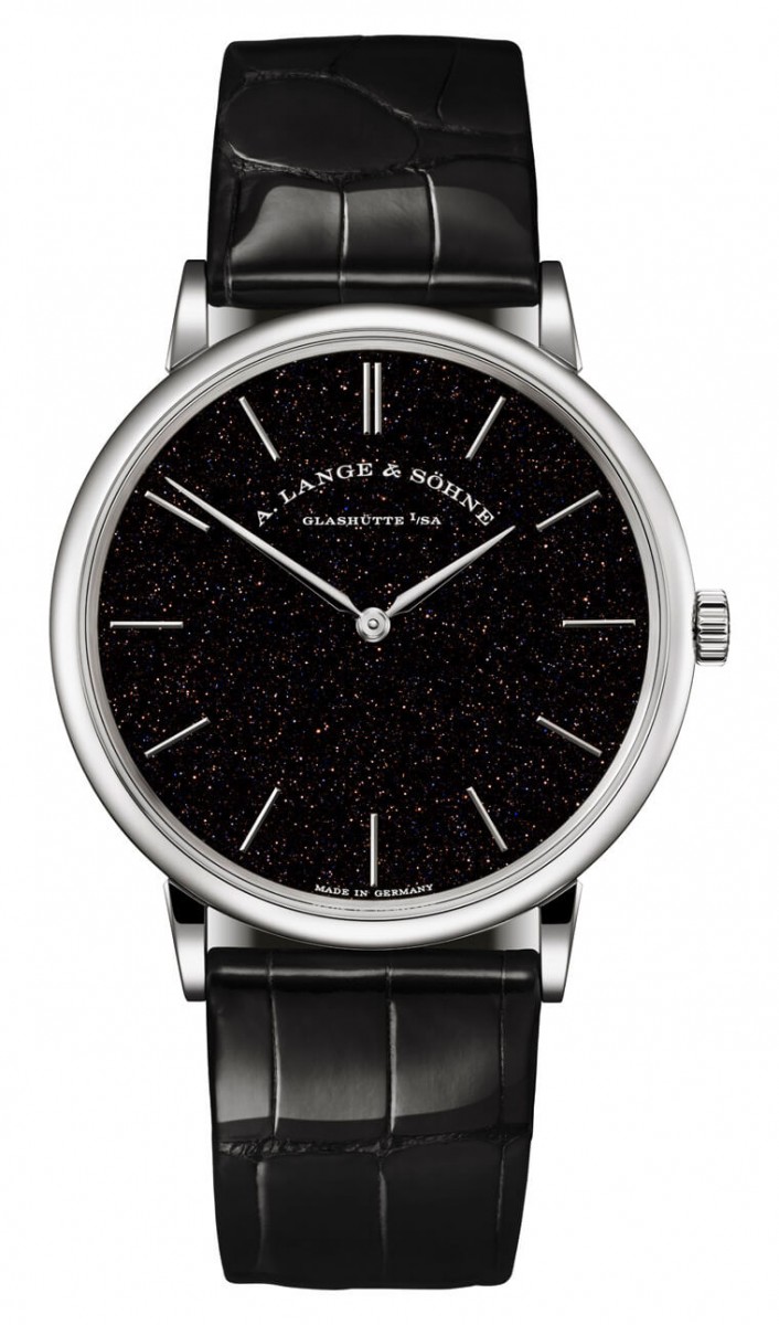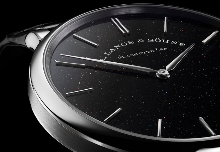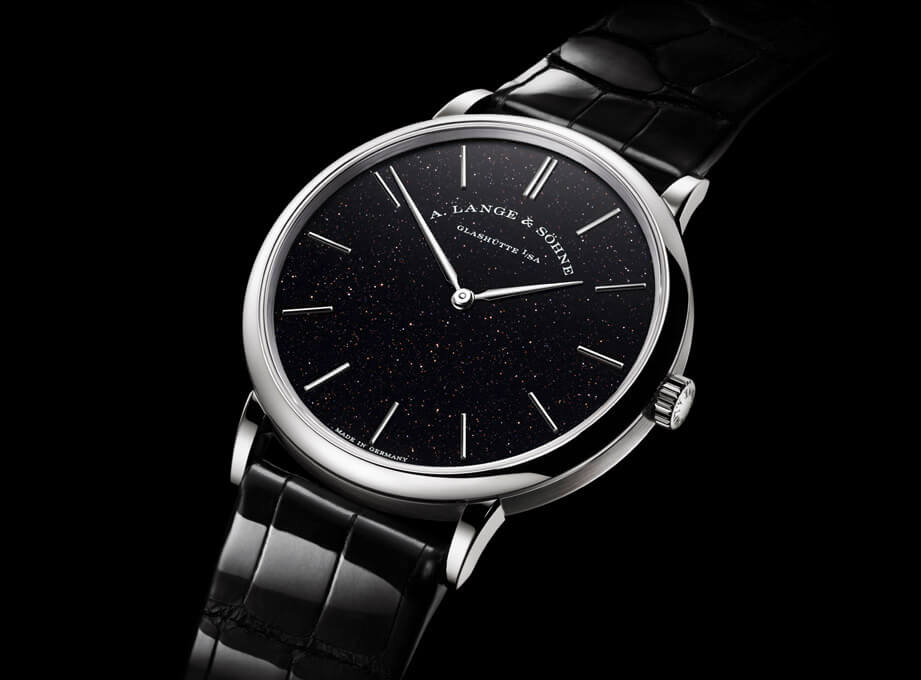 ▲砂金石是一種含有銅成分的玻璃,在加熱時,內含的銅成分會形成微小的晶體,形成視覺上的晶亮效果,2020年朗格首度開發出黑色的砂金石面盤。