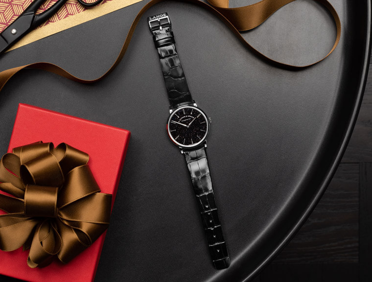 這次是朗格首次運用黑色砂金石玻璃製錶,此類面盤裝飾工藝於17世紀在威尼斯研發問世。簡單來說砂金石並非一種天然礦石,而是一種含有銅成分的玻璃,在加熱時,內含的銅成分會形成微小的晶體,這解釋了會什麼砂金石看起來會像一個微縮的宇宙星空,而為了讓面盤看起來不會顯得很雜亂,品牌在製作時也特別考慮到要將玻璃材質均勻地覆蓋在銀質的盤面中。
