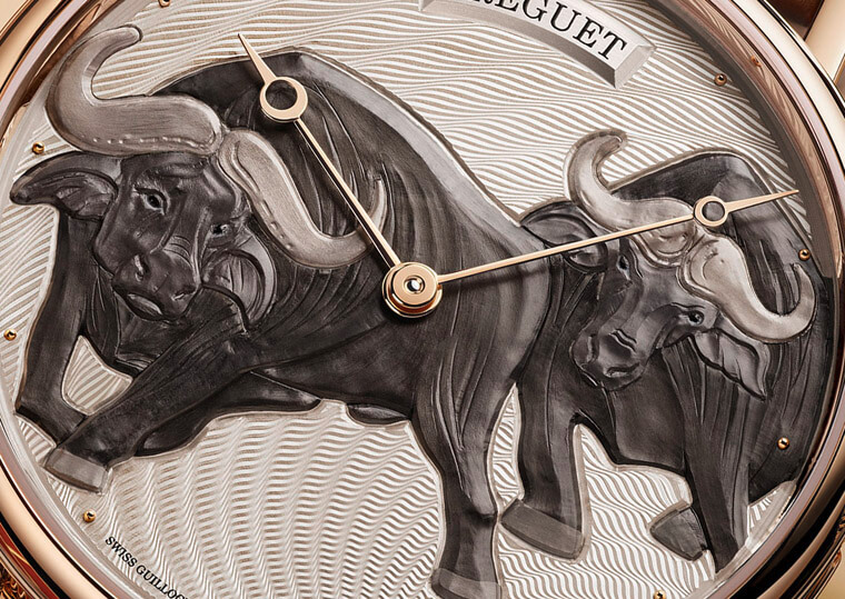 ▲在中國文化中,牛代表穩重、誠實和勤奮的形象,寶璣利用熟練的鐫刻工藝將金牛勾勒得躍然於面盤之上。