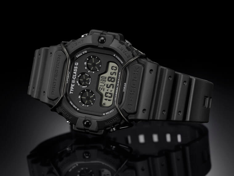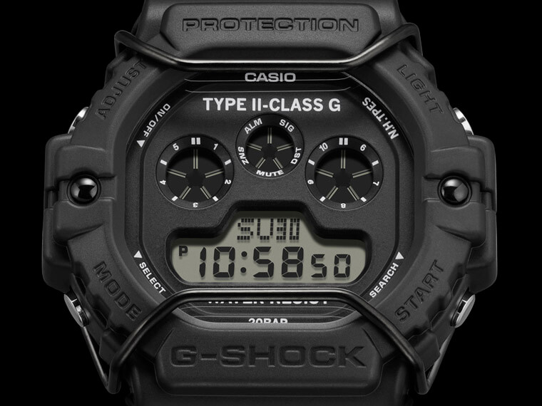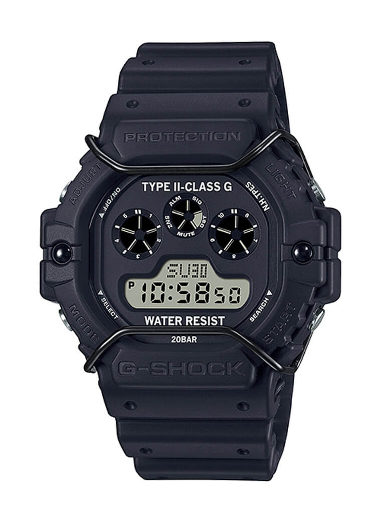 這次G-SHOCK x N.HOOLYWOOD最新的聯名款以DW-5900系列為基礎,因此手錶擁有系列招牌的三眼液晶小錶盤設計,N.HOOLYWOOD選擇以全黑造型灌注在DW-5900NH上,以簡約低調的手法來表現手錶的軍事風格。錶款以樹脂材料製作51.4×46.8×15.5mm的錶殼,其中15.5mm的厚度在G-SHOCK旗下顯得相對輕薄,不過錶款該有的防撞保護框設計依舊矗立在錶殼表面。