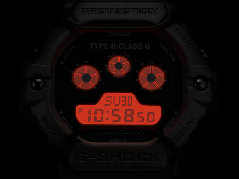 錶款面盤12點方向印有”TYPE II-CLASS G”除了帶有軍事風格的意涵,這裡面的字母”G”剛好也呼應了雙方第”7”次聯名的淵源(G排在英文字母順序的第7位)。由於三眼小錶盤佔據了面盤大部分的空間,因此主要顯示時間的液晶顯示則是偏向集中在6點方向,在這個小範圍的空間中可以顯示包括時、分、秒日期與星期等資訊,而手錶的其他功能還包括萬年曆、世界時區、計時碼錶、倒數計時功能、鬧鈴等等,若佩戴者按下錶殼1~2方向的按把,則面盤會瞬間點亮橘紅色的EL背光燈,方便閱讀時間。